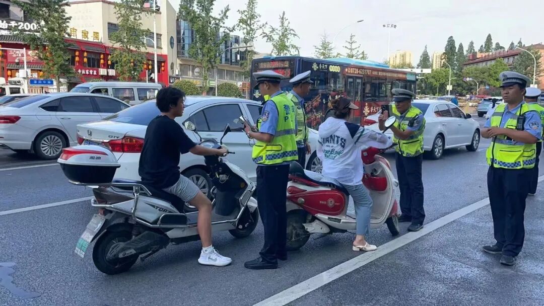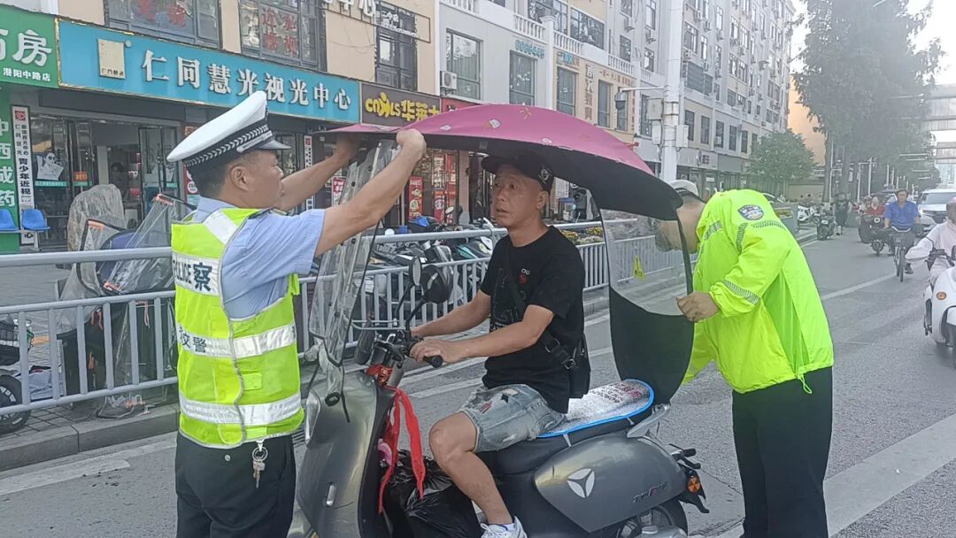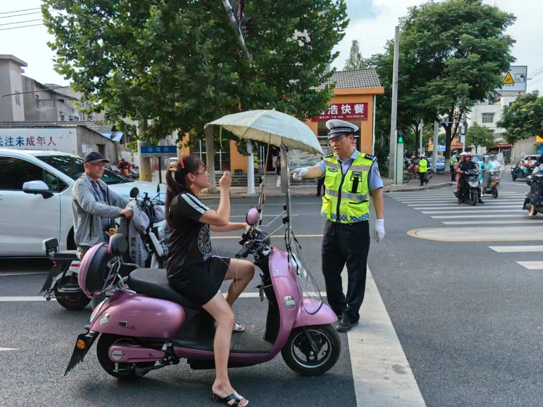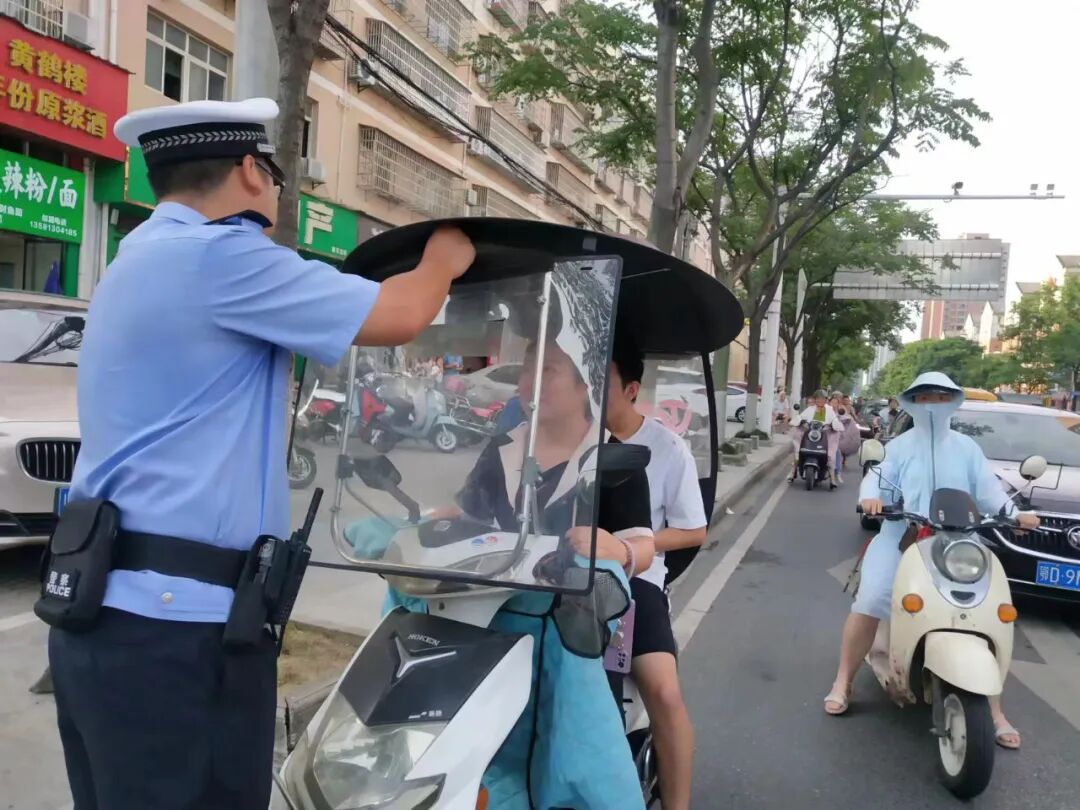 潜江交警科学研判摩托车、电动车出行规律特点,加大路面巡逻,在早晚高峰时段、平峰时段合理布设执勤卡点,以人员密集区域周边道路为重点,全面加大执法检查工作力度,集中整治不戴安全头盔、安装遮阳棚(伞)、不靠道路右侧通行或不在非机动车道内行驶、闯红灯、逆向行驶、无序停放等违法行为。