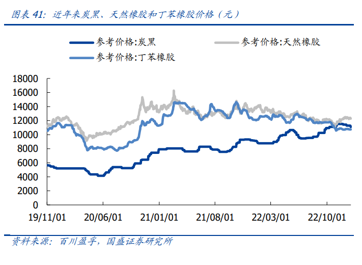 轮胎行业成本改善,国产胎有望引来突破。轮胎行业主要原材料炭黑价格受油价和俄 乌战争影响一路走高,22 年下半年,主要原材料天然橡胶、合成橡胶均处于下降趋势, 整体原材料有望随着橡胶类原材料下降而回归俄乌冲突前。海运费方面,2022 年以来 呈单边下跌,港口堵塞问题得到大幅度缓解,导致海外经销商前期订单大量到库,库存 水平较高影响轮胎企业海外工厂订单,从而影响前三季度业绩。随着下游逐步销售正常 化,海外经销商库存水平目前已经回到正常水平。