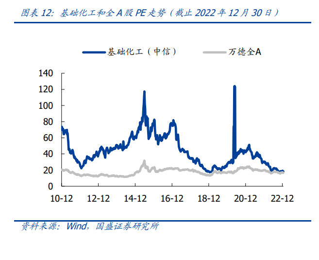 行业估值呈持续上行趋势:从行业估值来看,基础化工行业整体 PE 在 2022 年 10 月 28 日处于历史最低位 16.94 倍,此后在低位保持震荡。截止 2022 年 12 月 30 日,基础 化工平均 PE 为 18.32 倍,全 A 股平均 PE 为 16.74 倍;基础化工行业整体 PB 为 3.05 倍,目前全 A 股 PB 为 1.60 倍。