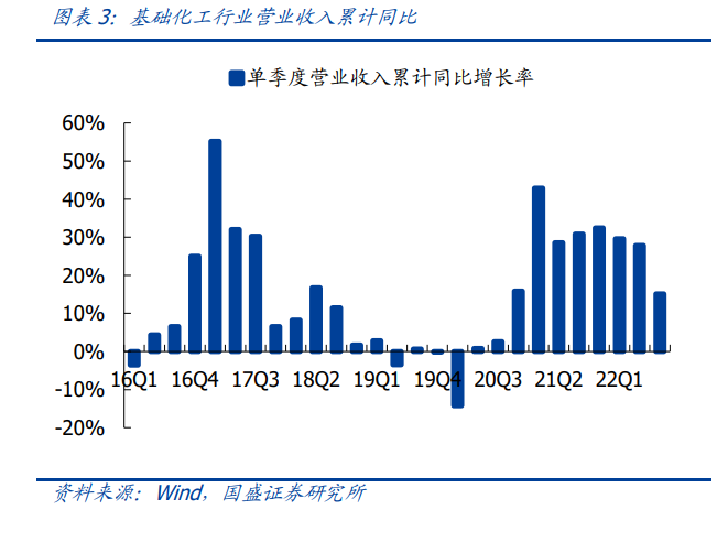 营业收入、归母净利润增速环比下滑。2021 年 Q3 单季度,基础化工行业营业收入实 现同比大幅增长 30.86%,增速较 2021 年 Q2 环比上升 2.27pct;实现归母净利润同比 增速 100.43%,增速较 2021 年 Q2 环比下降 16.41pct。2022 年 Q3 基础化工板块营业 收入同比增长 15.15%,归母净利润同比下降 10.01%,增速较 2022 年 Q2 环比分别下 降 12.66pct、38.45pct。