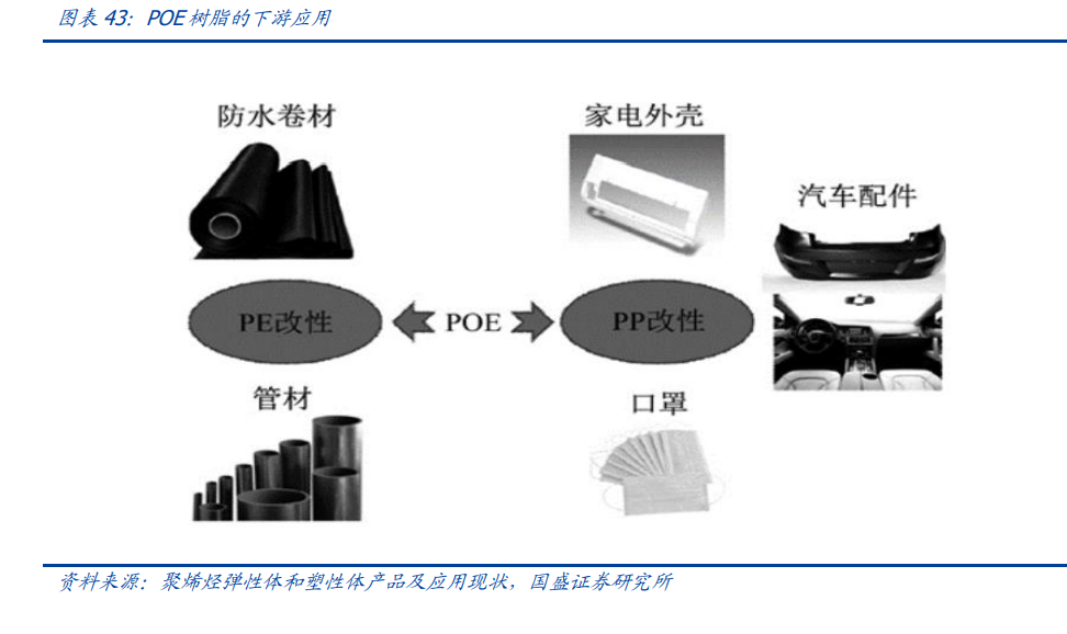 POE 性能优异,应用广泛。可以取代橡胶、柔性 PVC、EPDM、EPR、EMA、EVA、TPV、 SBC 和 LDPE 等材质,应用于不同产品,如汽车挡板,柔性导管,输送带,印刷滚筒,, 运动鞋,电线电缆、汽车部件、耐用品、挤出件、压模件、密封材料、管件和织物涂层 等,也可以作为低温抗冲改良剂来改善 PP 的低温抗冲性能,同时可以作为热塑性弹性 体运用于汽车领域。 汽车领域是 POE 重要应用。POE 密度在 860-890kg/m3 之间,在未发泡材料中密度最 低。在汽车上使用能使得汽车质量降低,减少能耗和废气排放,符合汽车轻量化要求。 同时,全球汽车工业已经对整车可回收性提出要求,我国关于汽车工业政策也明确规定 积极开展轻型材料、可回收材料、环保材料等车用新材料的研究,POE 具有良好的可回 收性,生产工艺更加绿色环保,POE 的生产和使用符合现行政策。同时,POE 价格与 传统增韧剂相比并未提高,替代传统增韧剂成为必然。