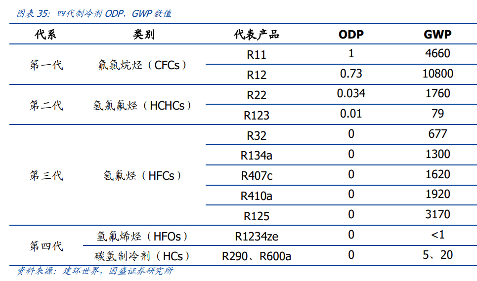 制冷剂对环境的潜在危害主要在臭氧消耗和温室效应两个方面,由 ODP(Ozone Depleting Potenrial,大气臭氧消耗潜能值)和 GWP(Global Warming Potential,全球 变暖潜能值)两个指标进行量化。ODP 数值按照第一代制冷剂 R11 为参照,设定 R11 的大气臭氧消耗值为 1。GWP 以二氧化碳为参照,设定二氧化碳的全球变暖潜能值为 1。 ODP 方面,第二代较第一代显著减少,第三、第四代制冷剂 ODP 则为 0。GWP 方面, 第一至第四代制冷剂核心品种 R12、R22、R32、R1234ze 的 GWP 值依次下降。