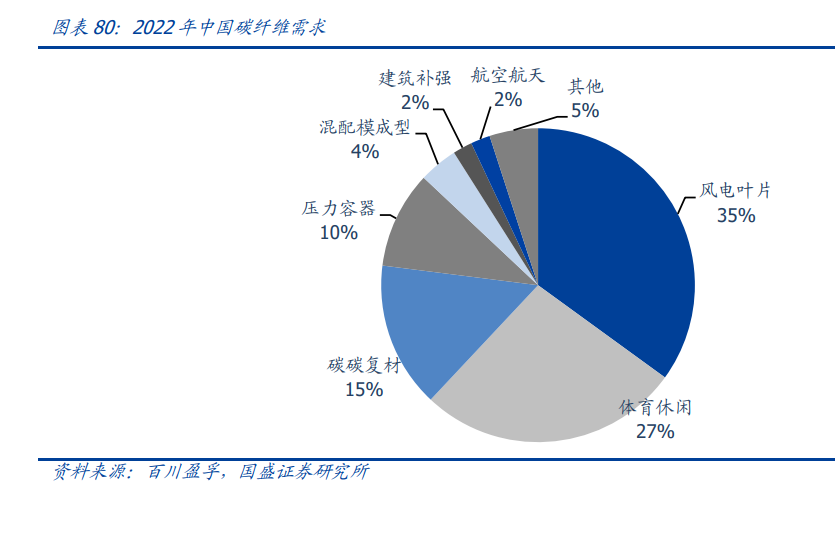 行业需求快速增长,航空价值最高,国内市场风电占比最大。根据赛奥碳纤维数据, 2021 年国内市场方面,2021 年碳纤维需求量为 6.24 万吨,对比 2020 年的 4.88 万吨, 同比增长 27.69%,同比增速远快于全球水平,其中风电叶片碳纤维需求量约为 2.25 万 吨,近期市场需求大幅度增长,整体市场处于供不应求,航空航天采用小丝束等高性能 碳纤维,下游对产品性能要求高和价格接受度较高,航空航天属于价值量最高的碳纤维 应用。风电和体育休闲等民用领域属于价格相对敏感,随着不断扩产,价格下降后碳纤 维性能优势体现替代其他产品,应用空间打开。