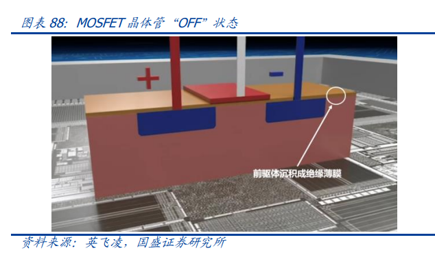 1)前驱体: 前驱体是用于制作氧化层的材料,主要用于晶圆制造中的薄膜沉积环节。晶体管是芯片中的基础结构单位,形成类似“开关”的功能。随着摩尔定律的发展,目前晶体管已 达到人头发直径万分之一大小,一个指甲大小的芯片拥有超过 10 亿个晶体管。 MOSFET 晶体管是运用最广泛的晶体管结构,全称为金属氧化物半导体场效应晶体管, 结构包括金属(metal)—氧化物(oxide)—半导体(semiconductor)。其中“氧化物” 层为前驱体材料通过化学反应等方式在集成电路晶圆表面形成具有特定电学性质的薄膜, 覆盖在集成电路芯片基底表面,形成集成电路中的电容介质或栅极电介质,起到绝缘的 功能。如果没有了前驱体,晶体管的核心功能将无法实现。