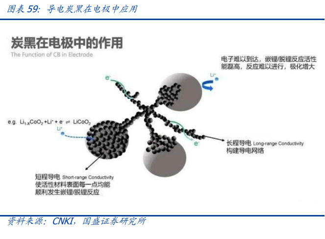 导电剂是重要的电极添加剂,可有效提升锂电池导电性能。磷酸铁锂与三元电极具备 良好的能量密度、安全性能、循环性能,然而导电率水平较低。导电剂作为正负极浆料 中重要添加剂,是连接活性物质与活性物质、活性物质与集流体之间的桥梁,可形成有 效的导电网络,在提升锂电池的导电性能。导电剂除了提升导电性,还可有效确保活性 氧化物颗粒与集流器的接触以及内部颗粒的较佳接触,并控制锂电池正电极的多孔性、 使电解质理想地接触氧化物颗粒,同时在负极中提升电极表面性能以防止电极膨胀。