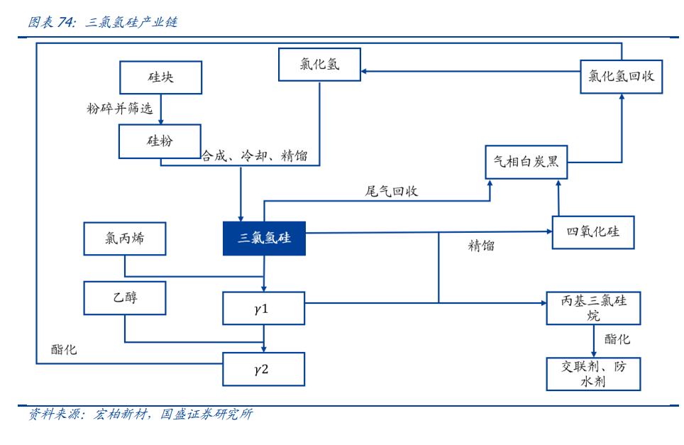 三氯氢硅是重要的光伏化工材料,需求受下游硅料拉动。三氯氢硅由金属硅粉与氯化 氢反应合成,下游主要用于多晶硅(光伏领域)以及硅烷偶联剂(塑料、胶黏剂领域)。 受光伏需求拉动,下游硅料(多晶硅)环节产能扩张激进,持续拉动原料三氯氢硅需求。