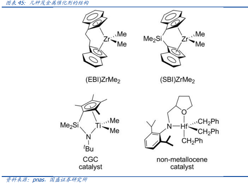 催化剂结构众多,专利壁垒和生产壁垒极高,带有易燃易爆物质,需要严苛条件才能 产业化生产。茂金属催化剂是指过渡金属原子与茂环(环戊二烯基或取代的环戊二烯基 负离子)、非茂配体三部分组成的有机金属络合物。根据发挥作用的不同,又可分为主 催化剂(茂金属化合物)、助催化剂(甲基铝氧烷(MAO)或阳离子活化剂)以及催化 剂载体(硅胶)。反应过程中需要的丁基锂,甲基铝氧烷(MAO)和氯化钛等,需要从 海外进口。主催化剂的茂结构来自于石油和煤炭中,较容易氧化,在工业化生产中储存 是个问题。目前光伏级用最经典 CGC 催化剂已经专利到期,其属于较早的催化剂,最 新 POE 相关催化剂开发结构和性能已经远超经典 CGC 催化剂,国内产业化过程中。