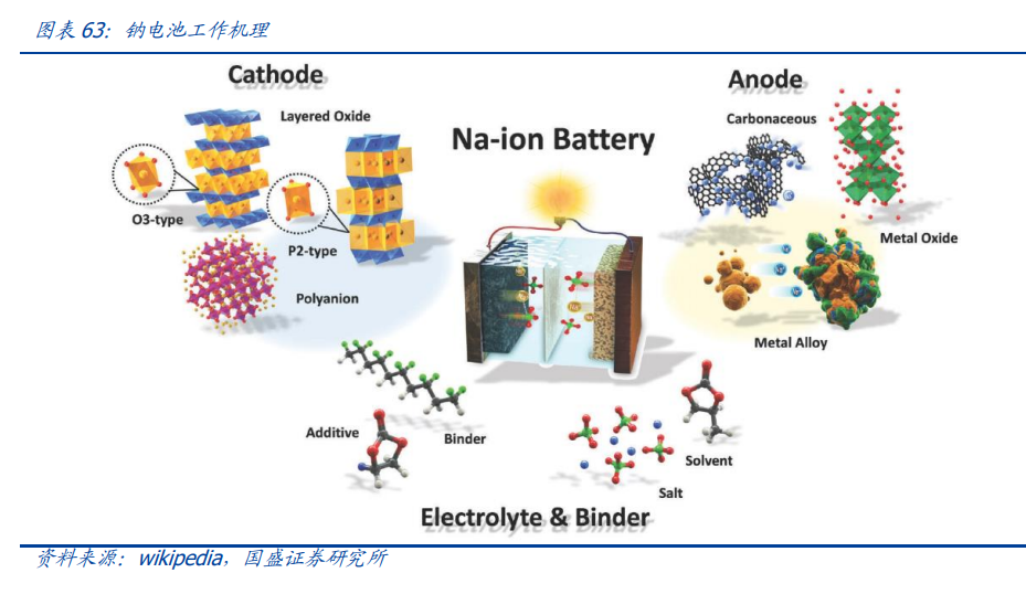 钠离子电池有着和锂离子电池相似的结构,通过“摇椅式”嵌入、脱嵌实现充放电。 钠离子电池组成部分包括正极、负极电解液、隔膜、集流体等,其工作原理为钠离子在 正极材料和负极材料之间“摇椅式”来回的嵌入和脱嵌。钠电池放电过程为钠离子从负 极材料里脱嵌,并通过隔膜到达正极形成化合物;充电过程为钠离子从正极中解嵌,通 过隔膜嵌入负极材料之中并与之形成化合物。