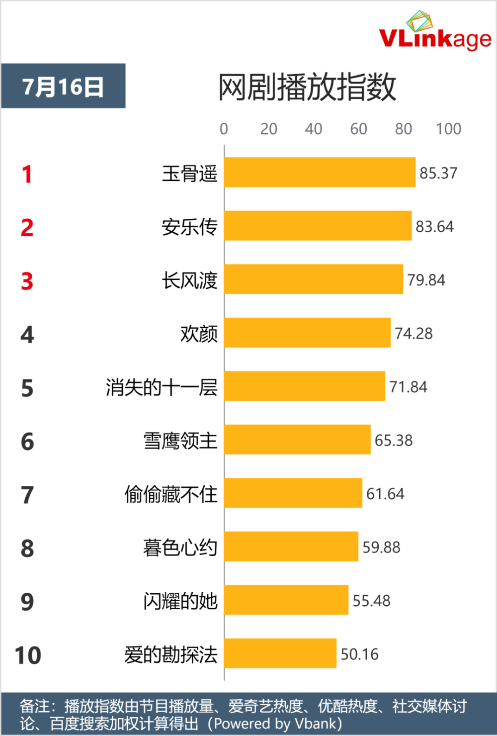 7月16日 #网剧播放指数#:1.#玉骨遥# 播放指数 85.37 2.#安乐传# 3.#长风渡# 4.#欢颜# 5.#消失的十一层# 6.#雪鹰领主# 7.#偷偷藏不住# 8.#暮色心约# 9.#闪耀的她# 10.#爱的勘探法#