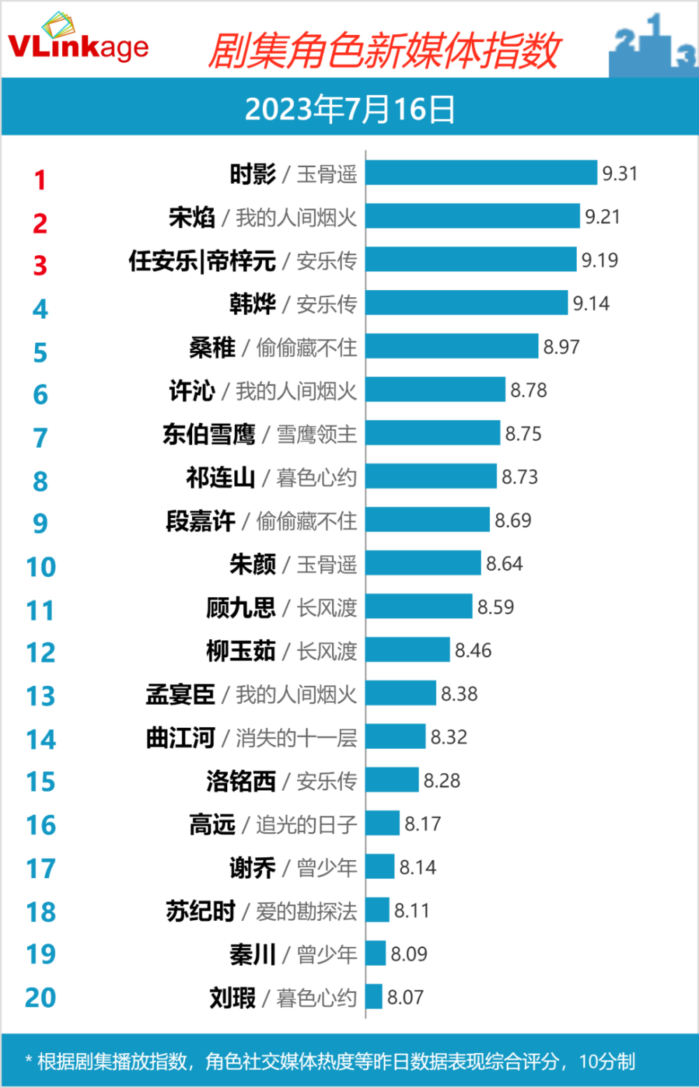 7月16日 #剧集角色新媒体指数#Top 20:时影/玉骨遥、宋焰/我的人间烟火、任安乐|帝梓元/安乐传、韩烨/安乐传、桑稚/偷偷藏不住、许沁/我的人间烟火、东伯雪鹰/雪鹰领主、祁连山/暮色心约、段嘉许/偷偷藏不住、朱颜/玉骨遥分列前十。