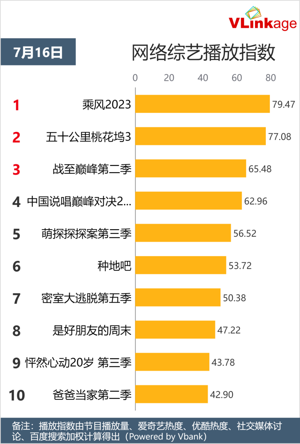 7月16日 #网络综艺播放指数#:1.#乘风2023# 播放指数 79.47 2.#五十公里桃花坞3# 3.#战至巅峰第二季# 4.#中国说唱巅峰对决2023# 5.#萌探探探案第三季# 6.#种地吧# 7.#密室大逃脱第五季# 8.#是好朋友的周末# 9.#怦然心动20岁 第三季# 10.#爸爸当家第二季#
