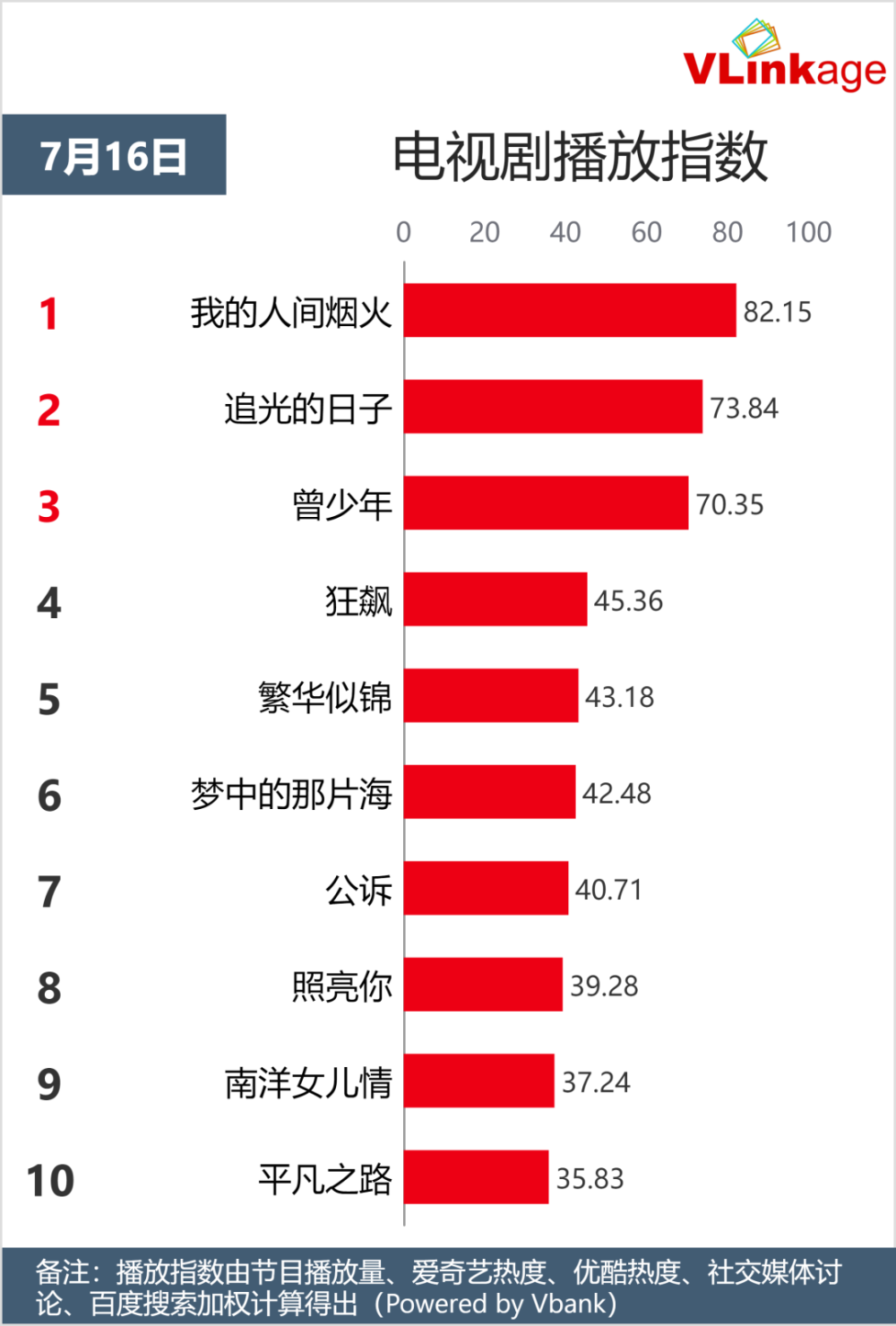 7月16日 #电视剧播放指数#:1.#我的人间烟火# 播放指数 82.15 2.#追光的日子# 3.#曾少年# 4.#狂飙# 5.#繁华似锦# 6.#梦中的那片海# 7.#公诉# 8.#照亮你# 9.#南洋女儿情# 10.#平凡之路#