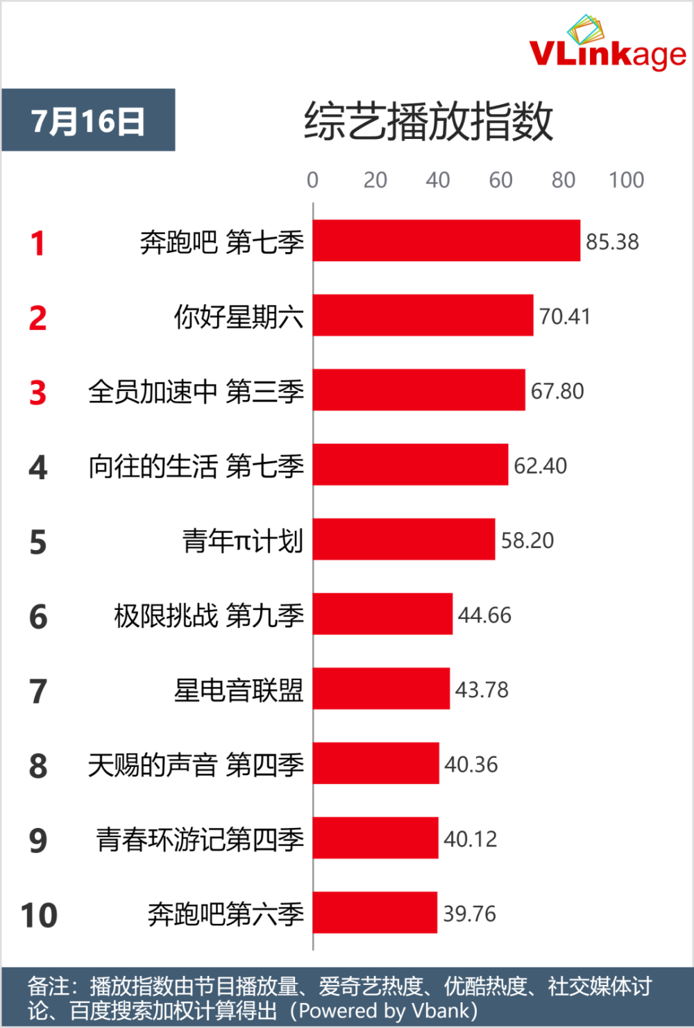 7月16日 #综艺播放指数#:1.#奔跑吧 第七季# 播放指数 85.38 2.#你好星期六# 3.#全员加速中 第三季# 4.#向往的生活 第七季# 5.#青年π计划# 6.#极限挑战 第九季# 7.#星电音联盟# 8.#天赐的声音 第四季# 9.#青春环游记第四季# 10.#奔跑吧第六季#