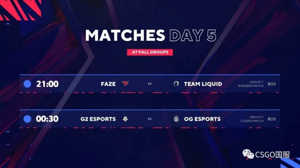 今晚21:00起将进行两场BO3较量,分别是C组胜者组焦点战FaZe vs Liquid,败者组焦点战G2 vs OG,有G2的比赛不论胜败者组,都是焦点,欢迎届时收看。