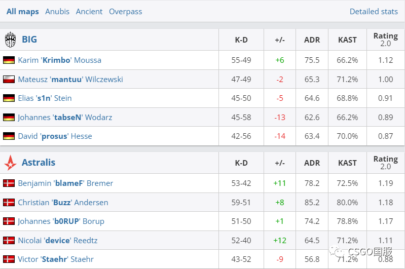 anubis上A队两位小将Staehr与Buzz的状态奇佳,A队全员发威轻松拿下图一。ancient上半场两队不相伯仲,然而A队在优势防守方却惨遭德国战车的一波流平推,丹麦人防守仅拿3分便丢掉图二。决胜图两队打的非常焦灼,防守方的device大狙频频立功,但换边后丹麦队的进攻却迟滞不前。而BIG小将Krimbo单图27杀疯狂carry,还有mantuu一旁输出,德国队最终让一追二完成翻盘。