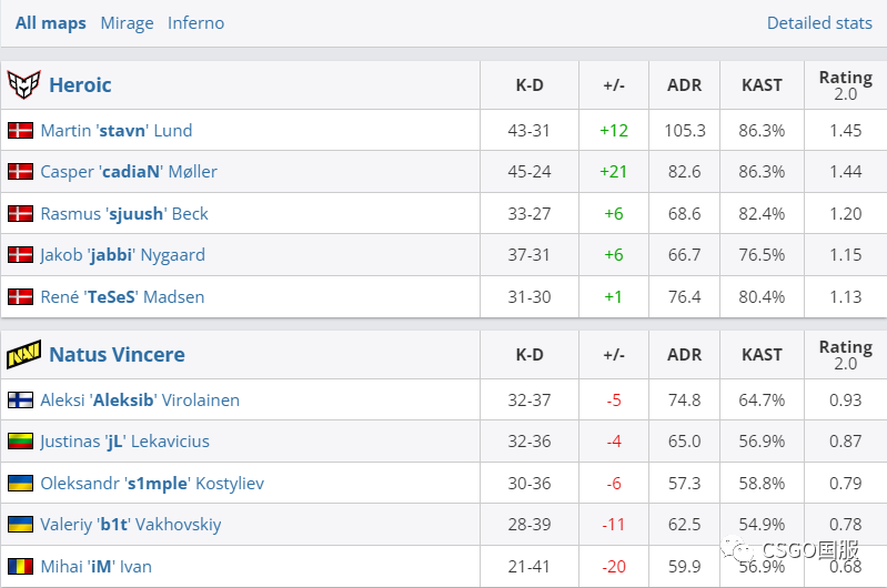 图一mirage上半场两队打得有来有回,但NaVi换边做防守方后仅拿3分。点子哥的灵性指挥,与jabbi等人轮番制裁对手。图二inferno上半场Heroic在进攻方豪取11分,点子哥大狙完成残局1V3堪称杀人诛心。NaVi的4大火力点全部哑火,换边后丹麦人早早拿下赛点带走胜利。