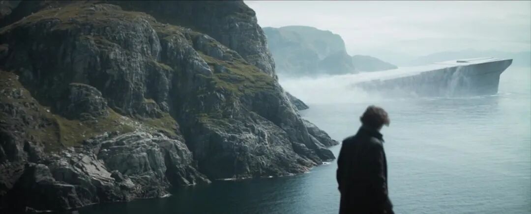 影片中厄崔迪家族生活的卡拉丹有山石与海洋环绕(图2左),几乎每一个关键的叙事段落都以生态官能审美感知为基调:父子议论政治的高耸悬崖、“姐妹会”造访时的暴雨天气、保罗决定出发前伸手触摸海水的礁石景观等,给人清新湿润的感官触觉的同时,也渲染了冷刹肃穆的情绪氛围、预示灭族灾难降临。而当保罗前往厄拉科斯时,生态影像则表现为德勒兹意义上的任意空间:飞船降落时俯瞰地表的巍峨沙漠景观、沙虫吞噬香料机的震撼过程,直到庞大的沙虫涌现全貌、与渺小的人类形成巨大反差(图2右),生态巨物的崇高感达到高潮,观众喷薄而出的情动感知也在此刻抵达峰值。