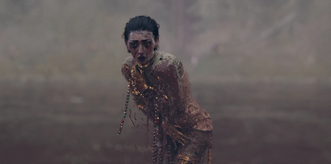 但这种对于自然物象的陌生化处理并不具备朗西埃意义上“以生产政治意识和动员形式为目的”的批判力,因为“辩证蒙太奇变成象征蒙太奇,谴责性的影像变成救赎性的影像”。35尤其是女妖重生后捂住肉身的羞耻动作(图3)暴露了人类中心主义立场。德勒兹将羞耻感视为一种批评实体,即精神起先好奇而冷静地看着身体所做一切,然后激动起来成为狂热的证人。36“吉巴罗”作为一个批评实体,在此既是殖民地的更是殖民者的:骑士既迷恋又羞辱女妖的身体,最后自己的身体沉葬于曾羞辱过的自然身体(心状湖)之内,后者由数字技术所美饰的乃是奇观化的黄金财富而非自然生态,其实讲述的是《堂·吉诃德》以来回响于西班牙文化中的“骑士修正主义故事”37。所以,衣锦还乡还是客死他乡没有本质区别,《吉巴罗》和商业灾难片的唯一不同仅在于生态英雄殖民之旅的失败结局。