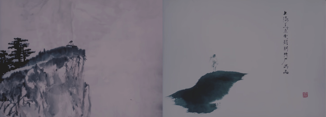 在审美形态上,人类即便身处山峰之巅(图4左)也始终保持和自然景观的融合关系,自身仅作为生态系统中的一个微小元素,这与《漫游者》大相径庭。尤其在影片结尾,人类创作者身份也以书法艺术形态在右边留白处题词(图4右),以画取形、书取象的形式展现了我国“书画同源”的美学思想,从而追求一种情景交融的意境美,这与浪漫主义激情政治的生态观也决然相反。
