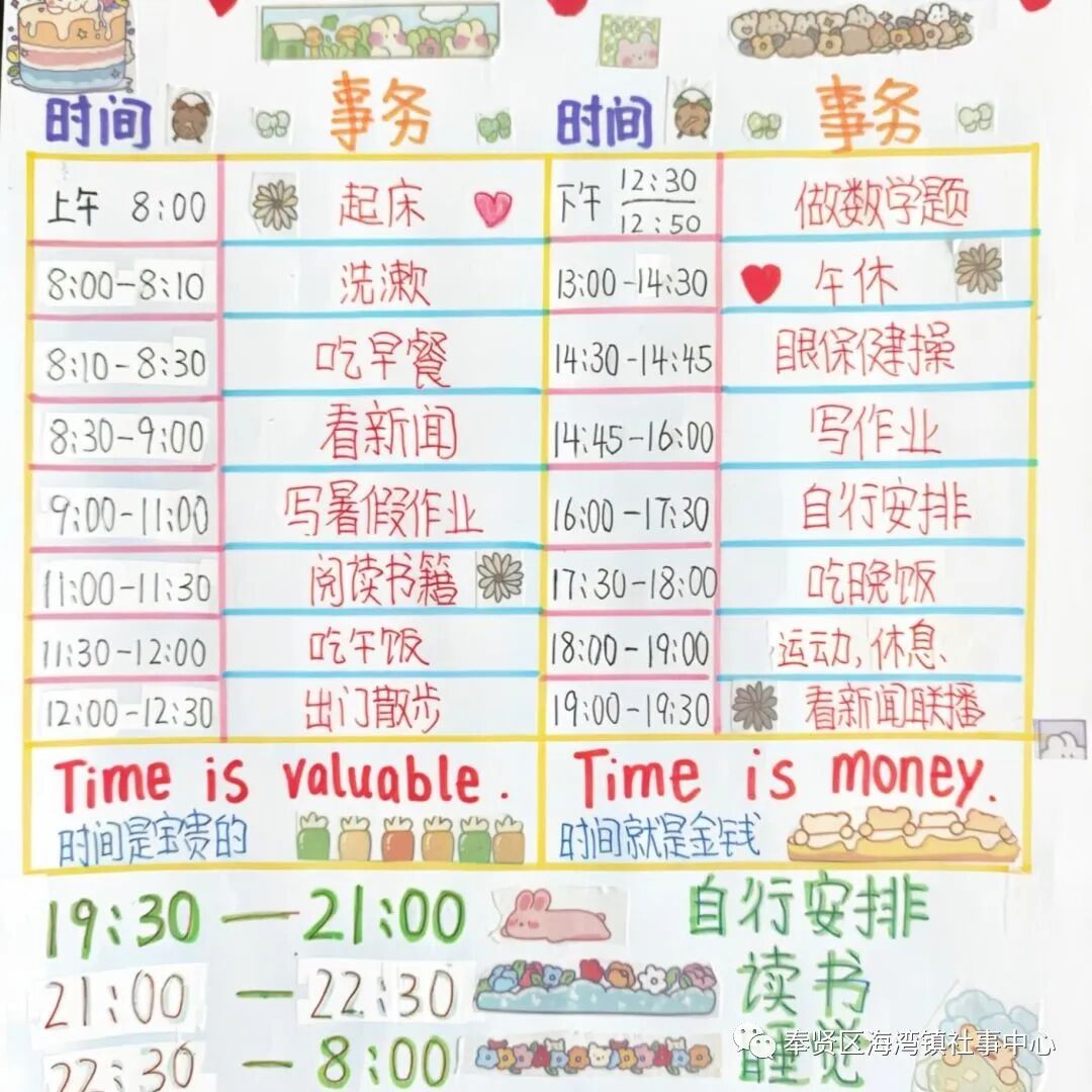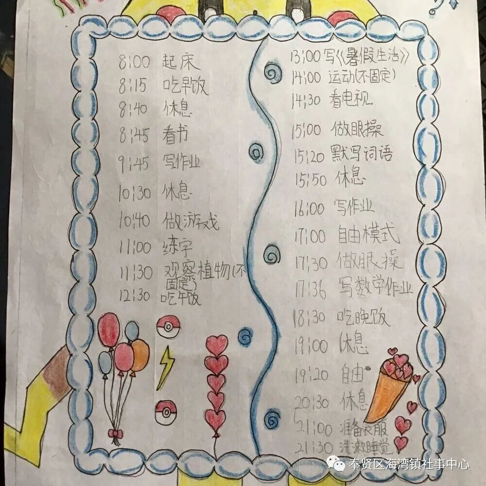 今年暑假,因疫情提倡“非必要不离沪”,外出旅游等活动减少了,这意味着孩子们有大量时间居家生活。为帮助学生度过一个“安全、健康、快乐、有益”的暑假,制定一份合理的暑假计划尤为重要,一起看看海湾镇的孩子们为自己制定的暑假计划表吧!