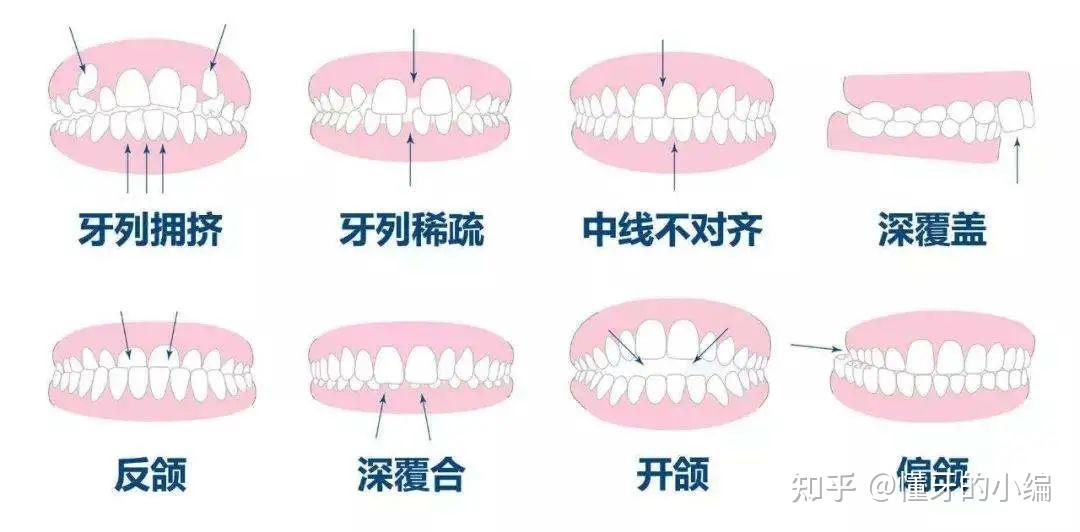 牙齿排列不整齐、拥挤、有缝隙、龅牙、嘴突、地包天、开唇露齿、咬合不良等等,都是错牙颌畸形的各种临床表现。