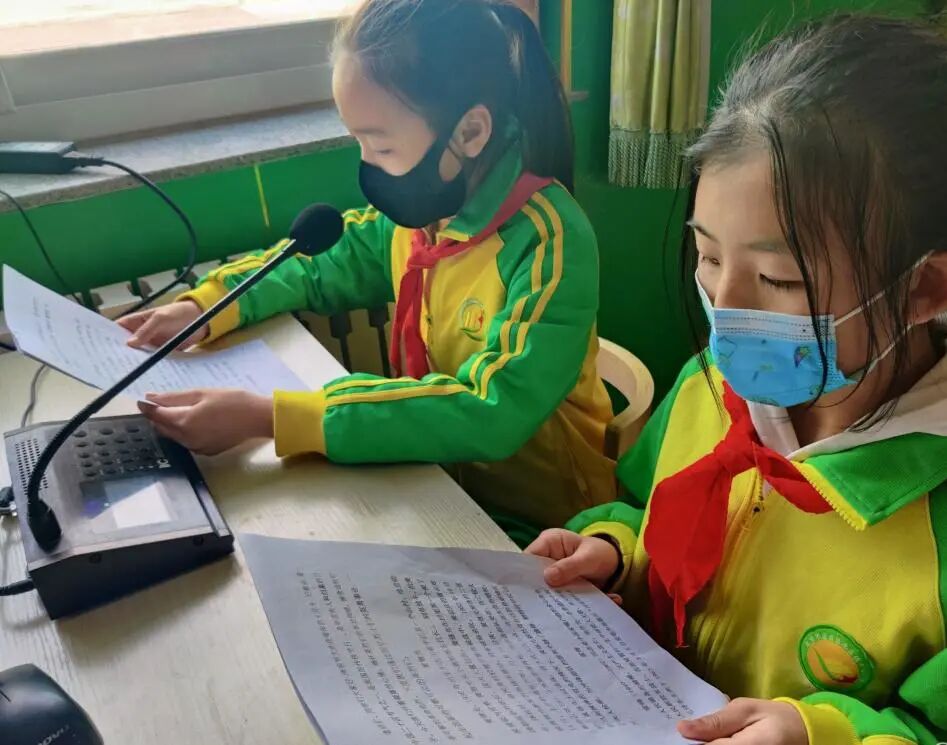 红领巾播音员夏艺轩、张洁利用班队会时间,通过校园广播宣传黄继光、王二小、雷锋等英雄事迹。
