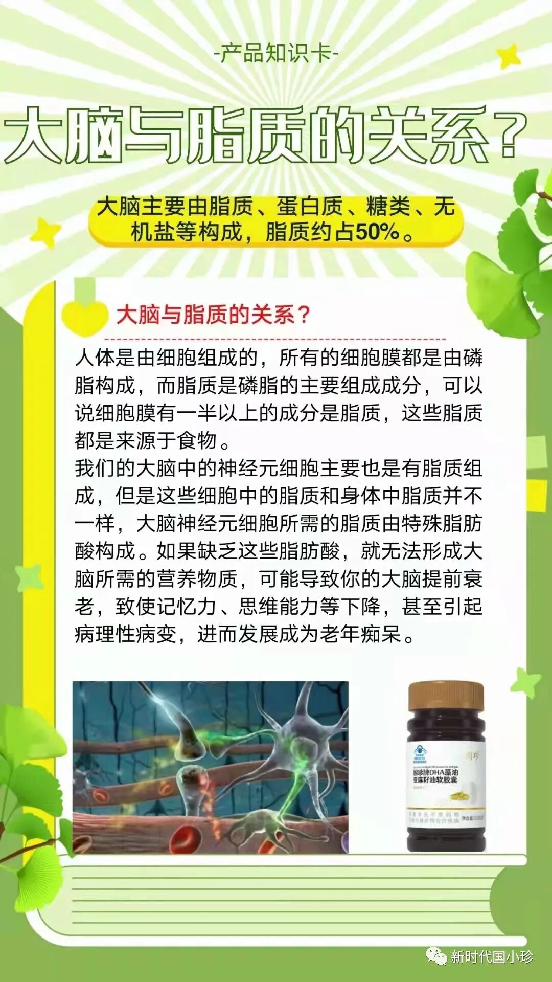 DHA为脑神经细胞提供充足的营养,有利于脑神经细胞突触的生长,加强神经细胞间的信息传递,从而延缓大脑萎缩和改善记忆力减退。