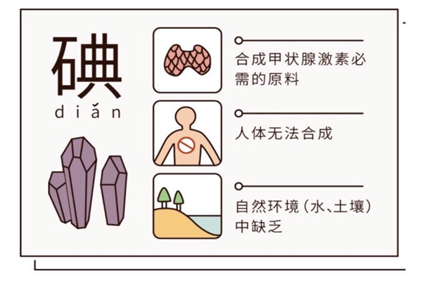 A: 碘是人体必不可少的微量营养素,它是人体合成甲状腺激素的主要原料,甲状腺激素参与身体新陈代谢,维持所有器官的正常功能,促进人体尤其是大脑的生长发育。