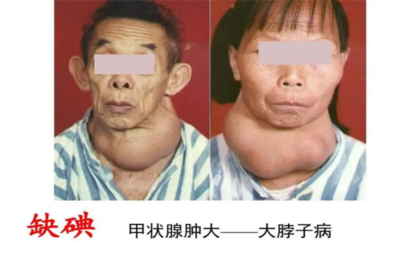 地方性甲状腺肿大是碘缺乏病最明显的表现形式,俗称粗脖根或大脖子病,主要表现为颈部变粗、呼吸困难、吞咽困难、声音嘶哑等。