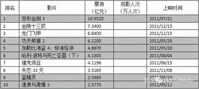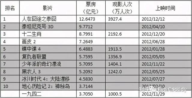 先来看看当时的市场情况,下面是2010年到2012年,国内年度票房的前十。