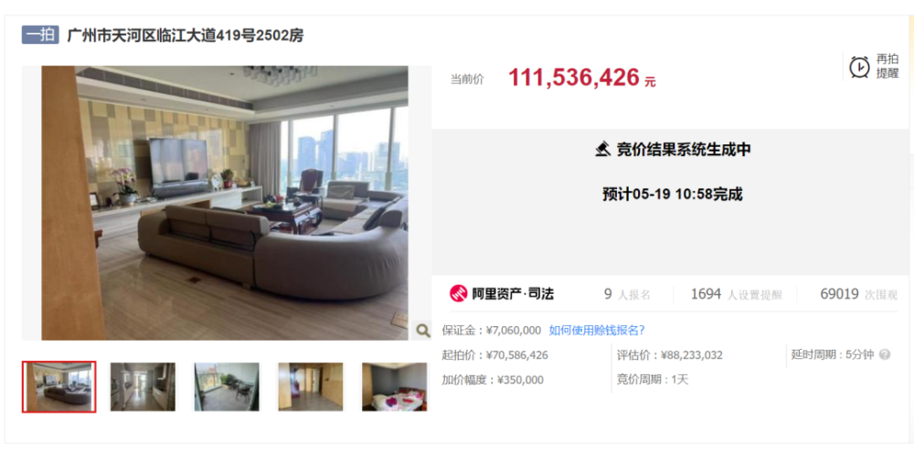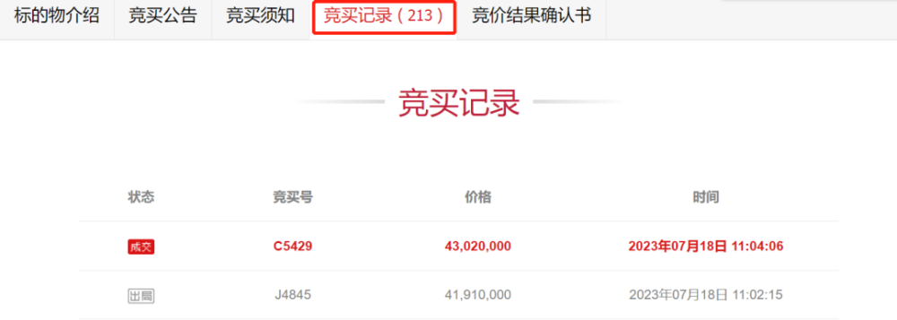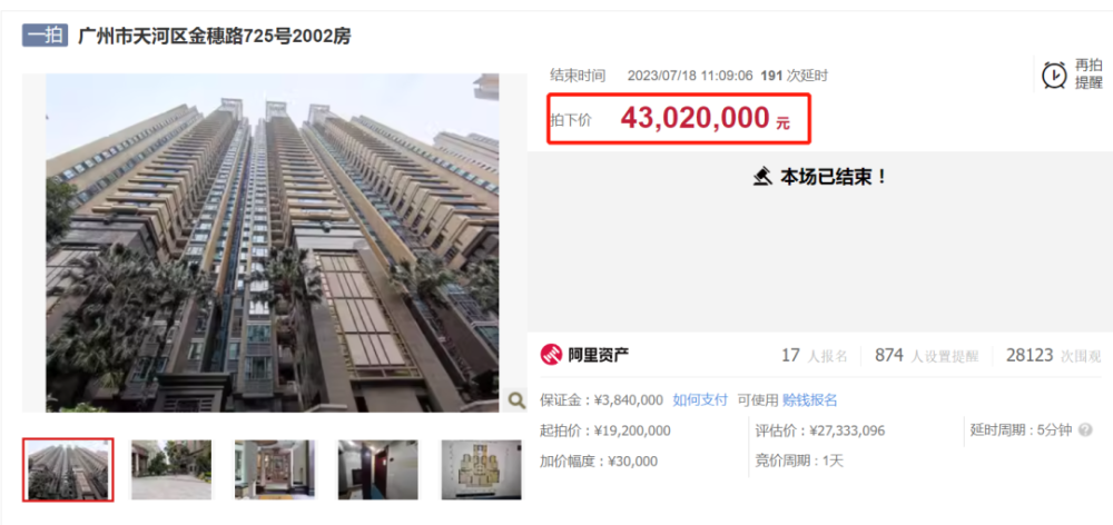 最后房子以高出市场评估价约1500万的姿态,即总价4302万,单价约17.5万/平的价格成功拍出!