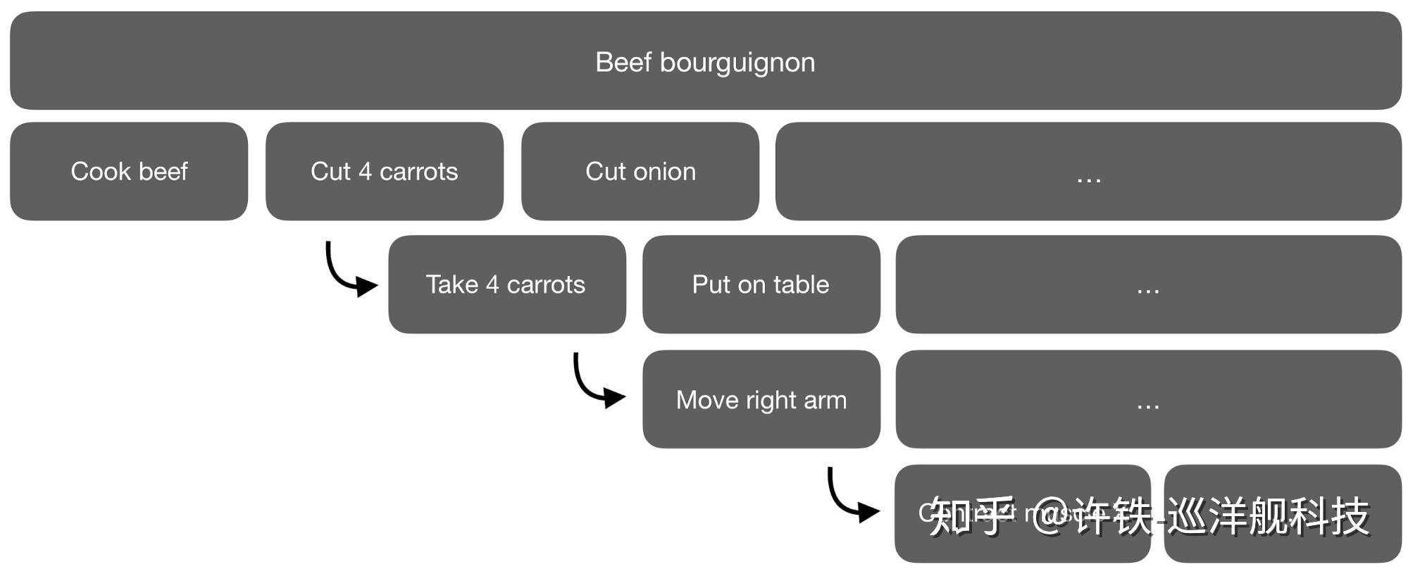 勃艮第牛肉的制作过程为例看层级化的强化学习。每个动作由更基本的动作组成,又成为更复杂的动作的基础。技能的构成体现层级嵌套的树结构