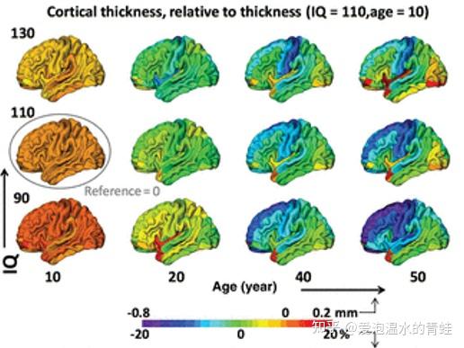另外的一项研究显示了同样的结果,并指出可能与儿童期大脑皮层的扩张有关[9]。在10岁时,智商较高儿童比智商较低儿童的大脑皮层稍薄,随着时间的推移,大脑皮层变薄的速度还会越来越快。而到了成年时,这种关系会得到逆转,智商高者,皮层会持续变得更厚。到42岁时,皮层越厚,智力就越高。相比之下,10岁以下的聪明儿童,其皮质表面更大,并且会持续扩张折叠为脑沟脑回,在青春期达到最大面积,这可能是导致皮层变薄的原因。