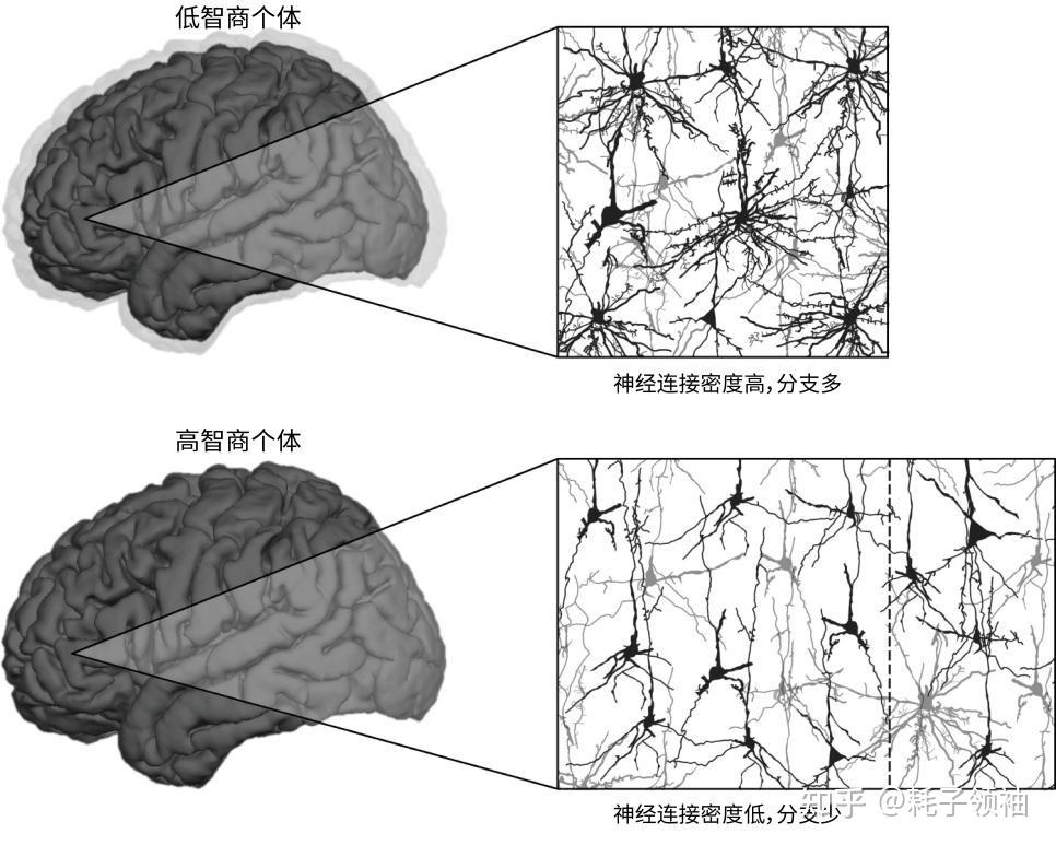这个现象可能有点反直觉,因为我们通常会觉得,聪明人脑子里的乱七八糟的神经连接应该会更多才对,不然他们怎么会这么容易一看题干就想出好几种解法?