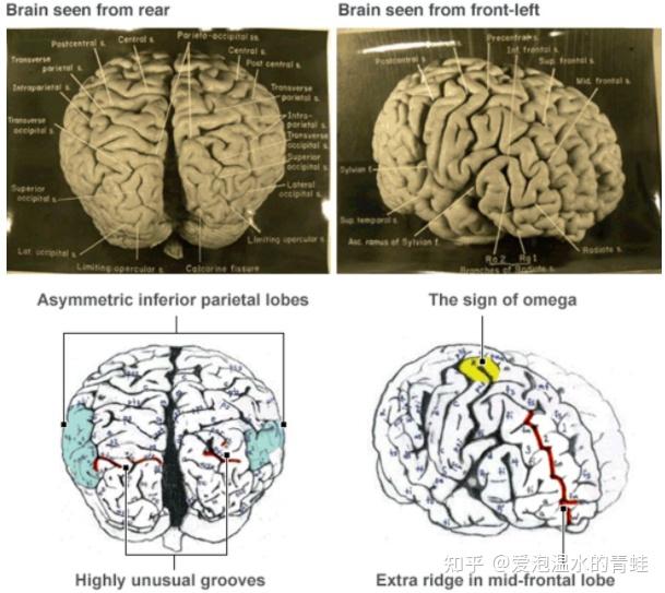 例如,有很多学者研究过爱因斯坦的大脑,其中学术界比较认可的一点,就是有文献说到爱因斯坦脑部左侧顶叶的神经胶质细胞比较丰富(白质发达)。而这一部分脑,正好负责空间想象和数学计算。