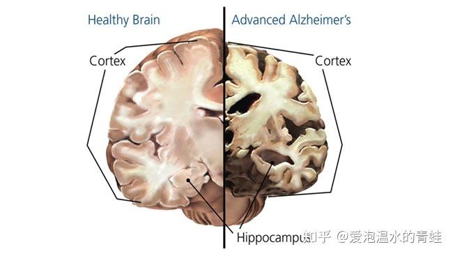 大脑截面观:左侧:健康大脑;右侧:阿尔茨海默病大脑
