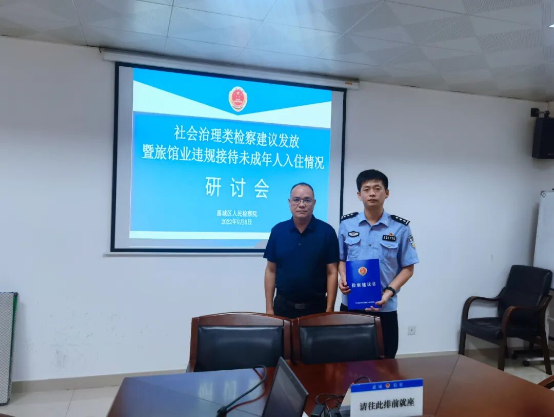 为进一步强化治安管理,加大打击犯罪力度,从源头上预防旅馆业住宿场所内侵害未成年人违法犯罪案件的发生,切实维护未成年人群体的合法权益,2022年9月8日,惠城区检察院召开了社会治理类检察建议发放暨旅馆业违规接待未成年人入住情况研讨会。