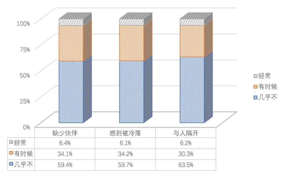 孤独是衡量心理健康的重要指标,是个体社会关系得不到满足时产生的负性情绪体验。总体上四成左右的青少年有时或经常感到缺少伙伴、被冷落或与别人是隔绝的。