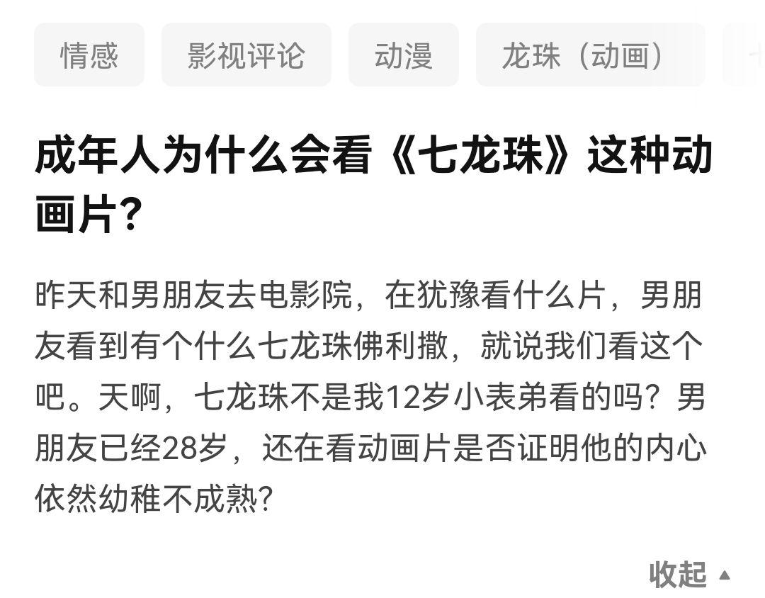 昨天和男朋友去电影院,在犹豫看什么片,男朋友看到有个什么七龙珠佛利撒,就说我们看这个吧。天啊,七龙珠不是我12岁小表弟看的吗?男朋友已经28岁,还在看动画片是否证明他的内心依然幼稚不成熟?