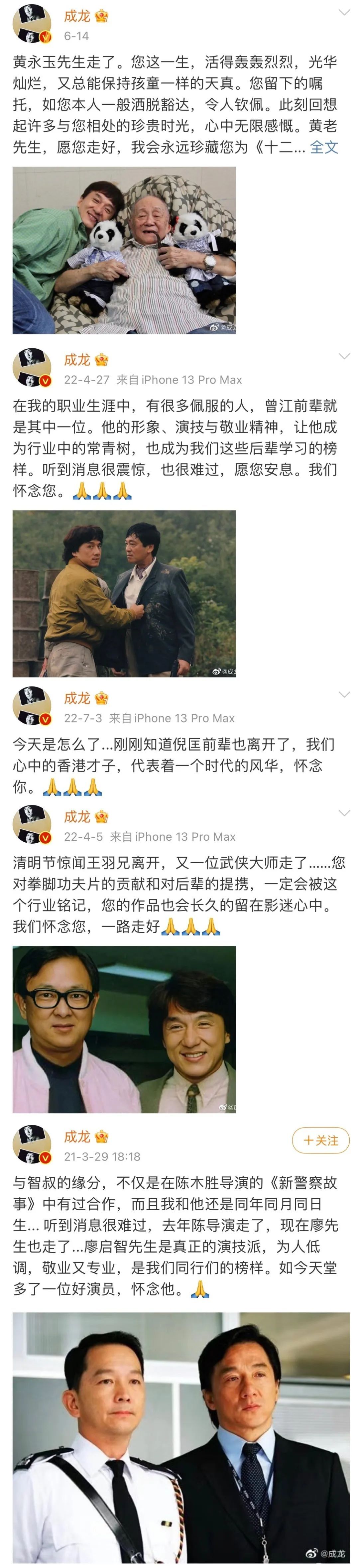 不知道成龙为老友们写下这些悼念文字时,该有多绝望。