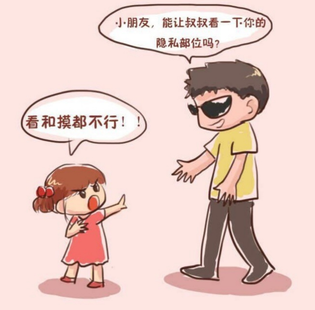 他人不必要却有意识地碰触你的隐私部位,就属于性侵害。隐私部位只有爸爸妈妈、特别亲近的主要看护者、医生可以看,而他们也只能在帮你洗澡,擦屁屁、换衣服或者生病了去医院检查时才能看。其他人、其他时间、任何地点都不可以!