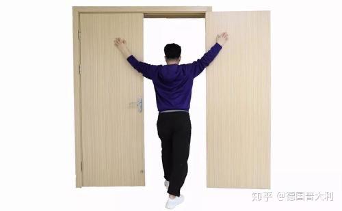1、胸大肌拉伸训练:你可以像下面的图片一样,找到一个门框把要拉伸的一侧手臂抬高90度后,手掌放在墙面,然后人向前走,当感受到肩下方有拉伸感后,保持1分钟,来回5-8次,双侧都要拉伸;
