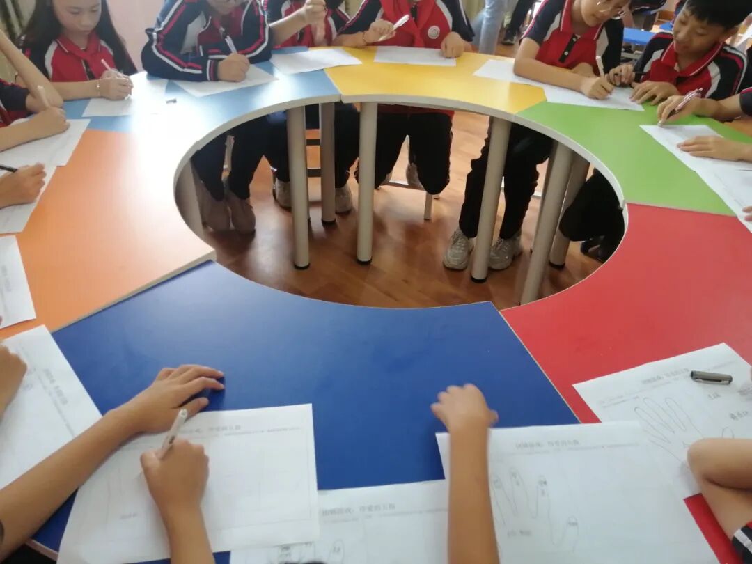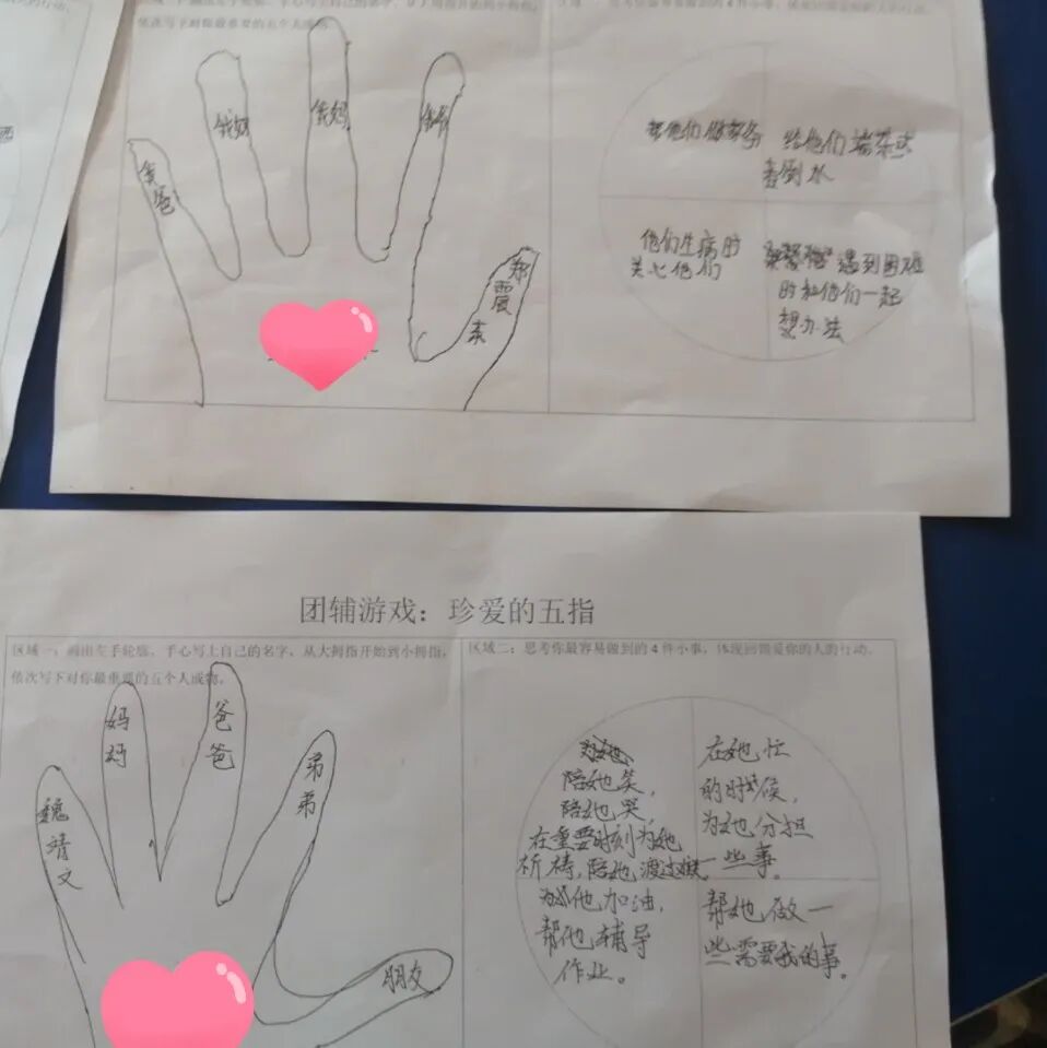 最后开展“重要的我们”团辅活动,孩子们在老师的引导下有序画出左手轮廓,依次写下重要的五个人。通过这个小游戏,孩子们都找到了自己最爱的5个人和自己能够为他们做的力所能及的事情,为自己或爱你的人而付诸行动。通过本次活动,让孩子们抒发了心声,学会爱身边的人,学会释放了压力和自我缓解,用积极乐观的心态快乐学习,健康生活。