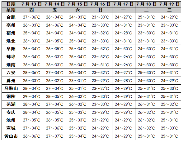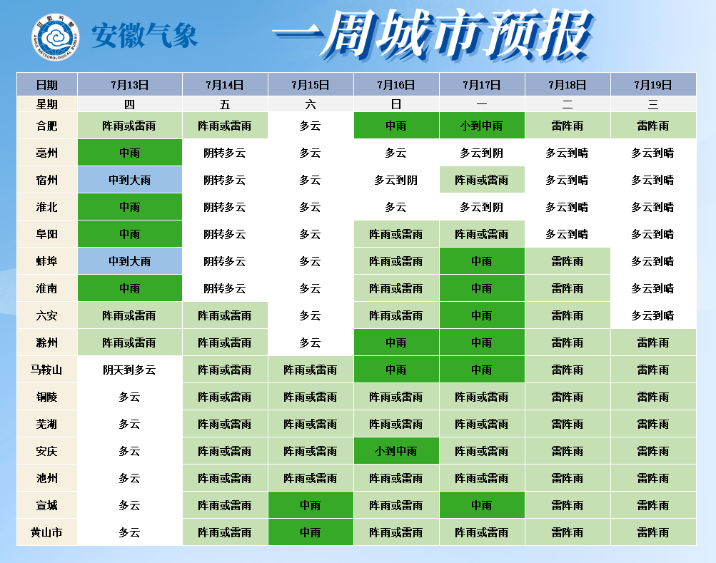 13日(周四):江北阴天到多云,大部分地区有阵雨或雷雨,其中淮北地区和江淮之间北部中到大雨,局部暴雨;江南多云。14日(周五):淮北地区阴天转多云,局部地区有阵雨或雷雨;淮河以南多云到阴天,大部分地区有阵雨或雷雨,局部中雨。15日(周六):江北多云;沿江江南阴天到多云有阵雨或雷雨,部分地区中到大雨,局部暴雨。16日至17日(周日至周一):淮北地区多云到阴天,南部有阵雨或雷雨;淮河以南阴天有阵雨或雷雨,部分地区中到大雨。18日至19日(周二至周三):淮北地区多云到晴天;淮河以南多云,大部分地区有雷阵雨。一周城市天气预报
