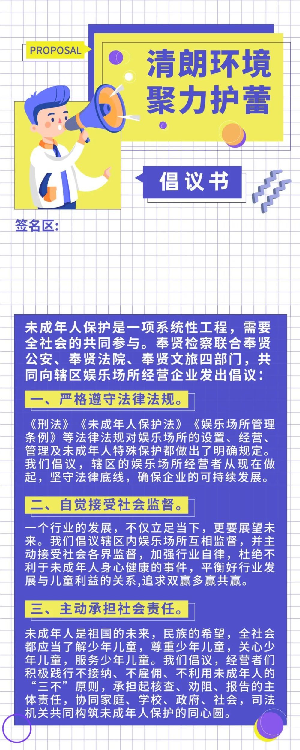奉贤区检察院联合奉贤区公安分局、法院、文旅局四部门,共同向辖区娱乐场所经营企业发出《“清朗环境 聚力护蕾”倡议书》。参会经营者在倡议书上签名。