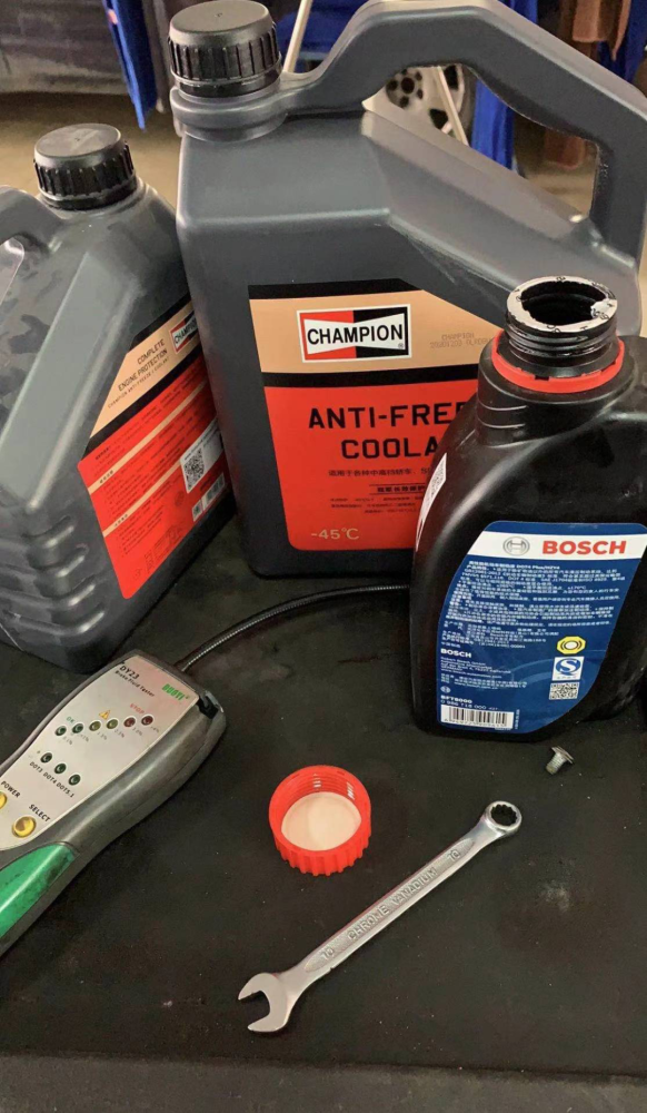 选择更换刹车油的服务,价格比较优惠,做活动的时候139元,活动结束恢复到199元。采用的刹车油品牌是博世DOT4 1L,产品很正。换刹车油比较费劲,制动分泵放油顺序每个车轮各有一个分泵,要一个人在驾驶室踩刹车,释放里面的废制动液,释放时有顺序要求,另外一个师傅在车底进行排放,比较细心。要提一下服务的瑕疵,但也算是个案吧,维修服务的时候,引擎盖旁边没有垫保护布,有油液滴到了前端塑料板上,腐蚀了面板,结果造成拆卸进气栅,重新给塑料板喷漆,显示出各个门店的操作规范把控不严格。