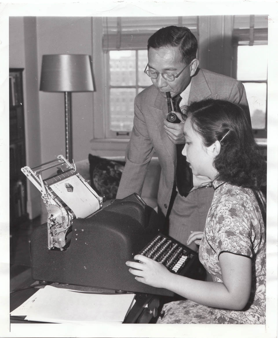 林语堂和女儿林太乙正在使用他发明的明快打字机,这台打字机的内部结构堪称天才,最终却没能量产。 (受访者供图/图)