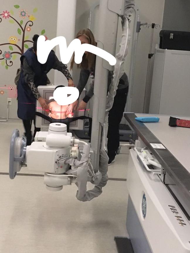 做检查,看着挺渗人,其实孩子还挺高兴,上面挂着屏幕放动画片