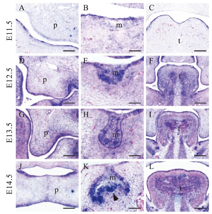 A—C:E11.5;D—F:E12.5;G—I:E13.5;J—L:E14.5;探针信号为紫色;p:腭板;m:磨牙;t:舌;比例尺:100μm.