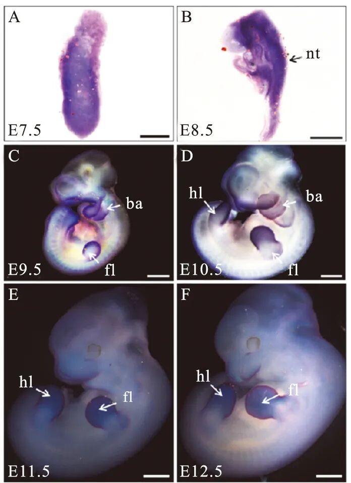 探针信号为紫色;nt:神经管;hl:后肢芽;fl:前肢芽;ba:鳃弓. A—B比例尺:500μm;C—F比例尺:1mm.